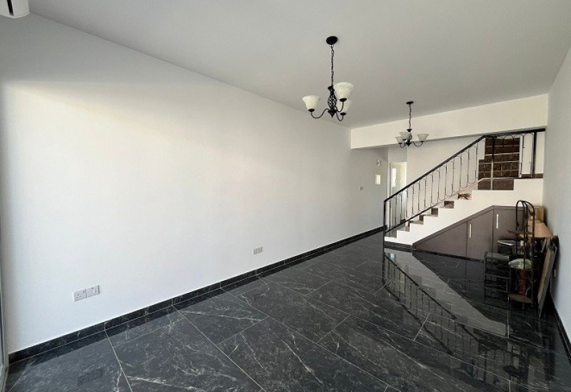 The property boasts an open-plan layout with spacious living and dining areas and a kitchen. Patio doors from the living area open to a covered veranda and entrance area. A guest WC is conveniently located on the same level. Upstairs, you'll find two generously sized bedrooms with fitted wardrobes; the master bedroom has access to a veranda. A family bathroom completes the upper level. The townhouse includes covered parking and is in excellent condition, having been recently renovated. It is sold unfurnished and comes equipped with air conditioning units. The living covered area is 75 sqm, with an additional 17 sqm of covered verandas. Title deeds are available.